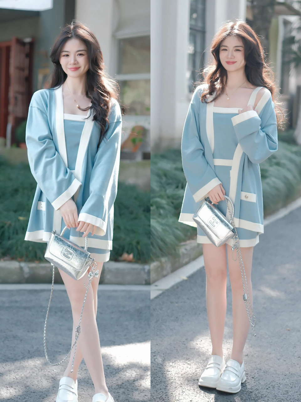可以根据自己的身形来选择适合自己的穿衣风格,若是长相甜美,个子小巧,腿型笔直,就可以用上面这一套雾霾蓝的针织裙装配上小白鞋短裙穿搭,正好形成了“下衣失踪”穿法,更好地呈现咱们的美腿,抢眼又吸睛。