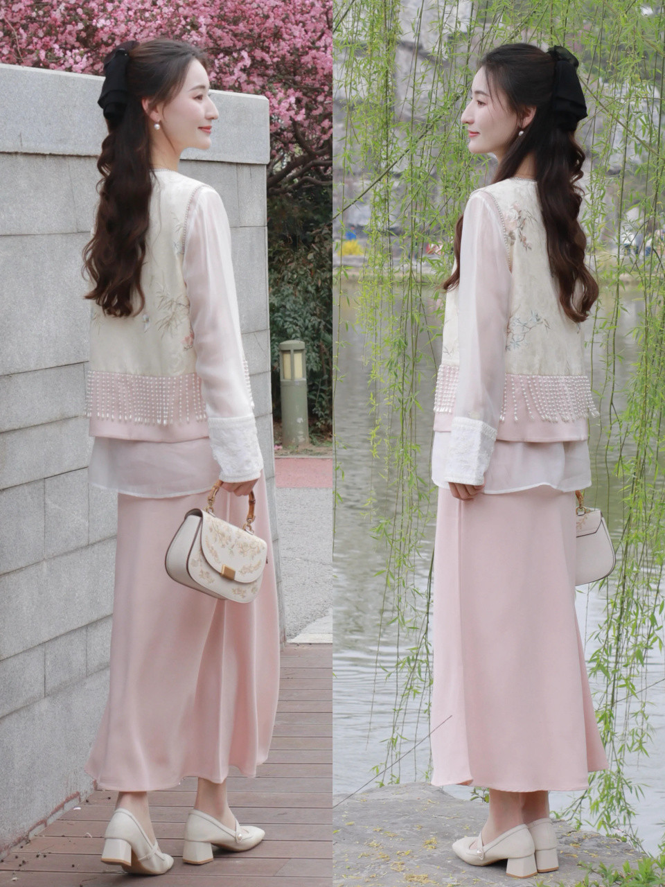 若是偏爱温柔甜美的穿搭格调,可以选择一条粉色的缎绸面料半裙,配上一件新中式的外套,内搭白色衬衫,少女感自显,不必刻意装嫩。