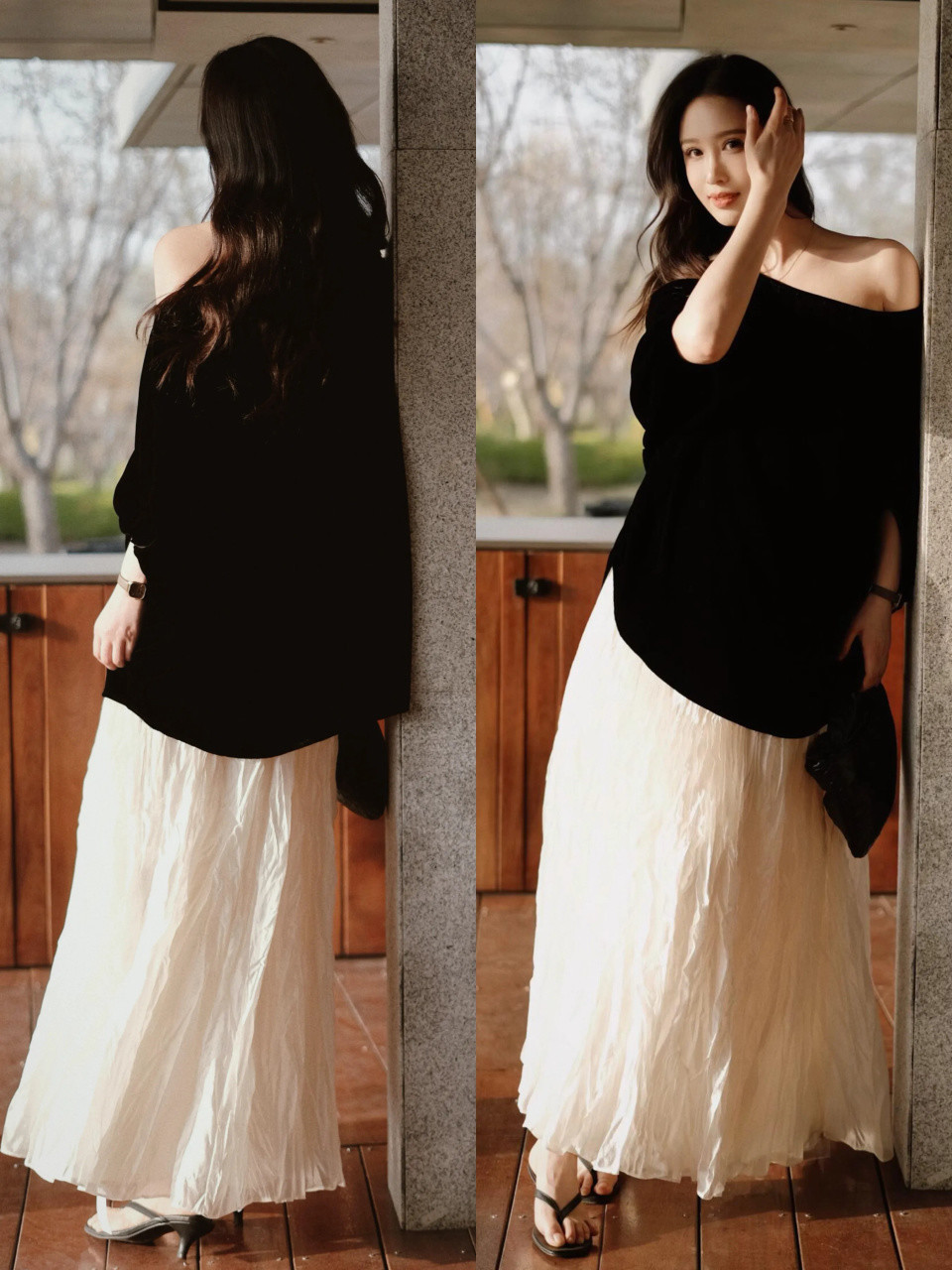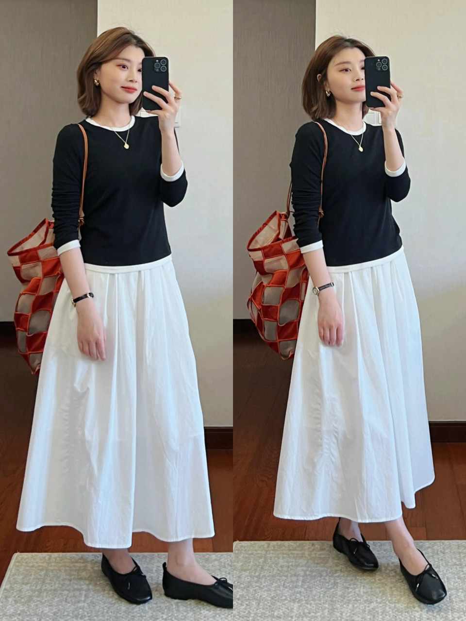 咱们穿衣配色不是那么的熟练,不妨直接选择黑色针织衫叠穿白色打底衫,下半身用高腰收腰款的白色伞裙,这样的黑白色调穿搭,经典耐看,永不过时,也不会容易出错。