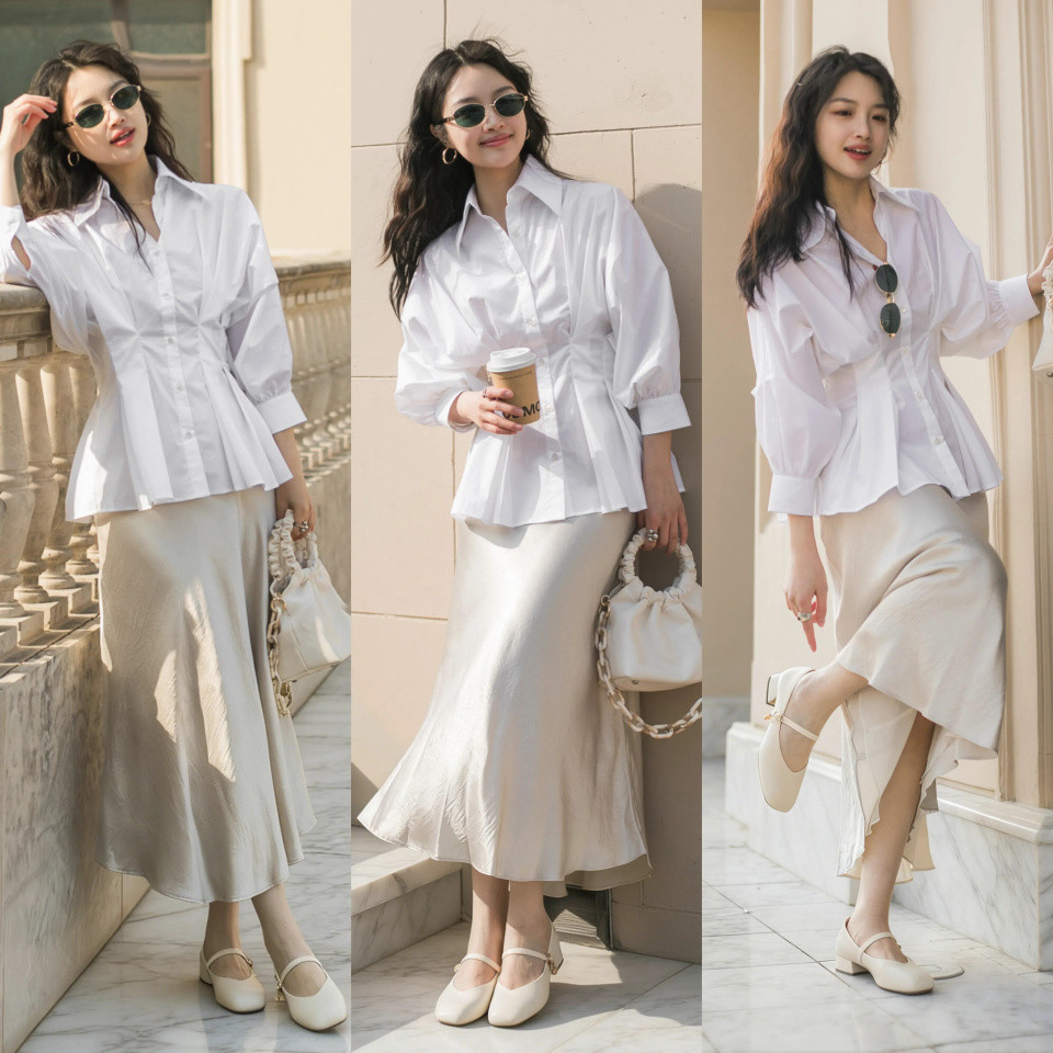若想让自己的造型更显高显瘦,这时不妨可以选择小众设计的收腰白色衬衫上衣,配上缎绸面料的高腰伞裙,脚踩一双白色的苏格玛丽珍鞋,就能使得身材变成三七分比例,显高显瘦。