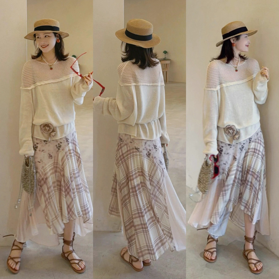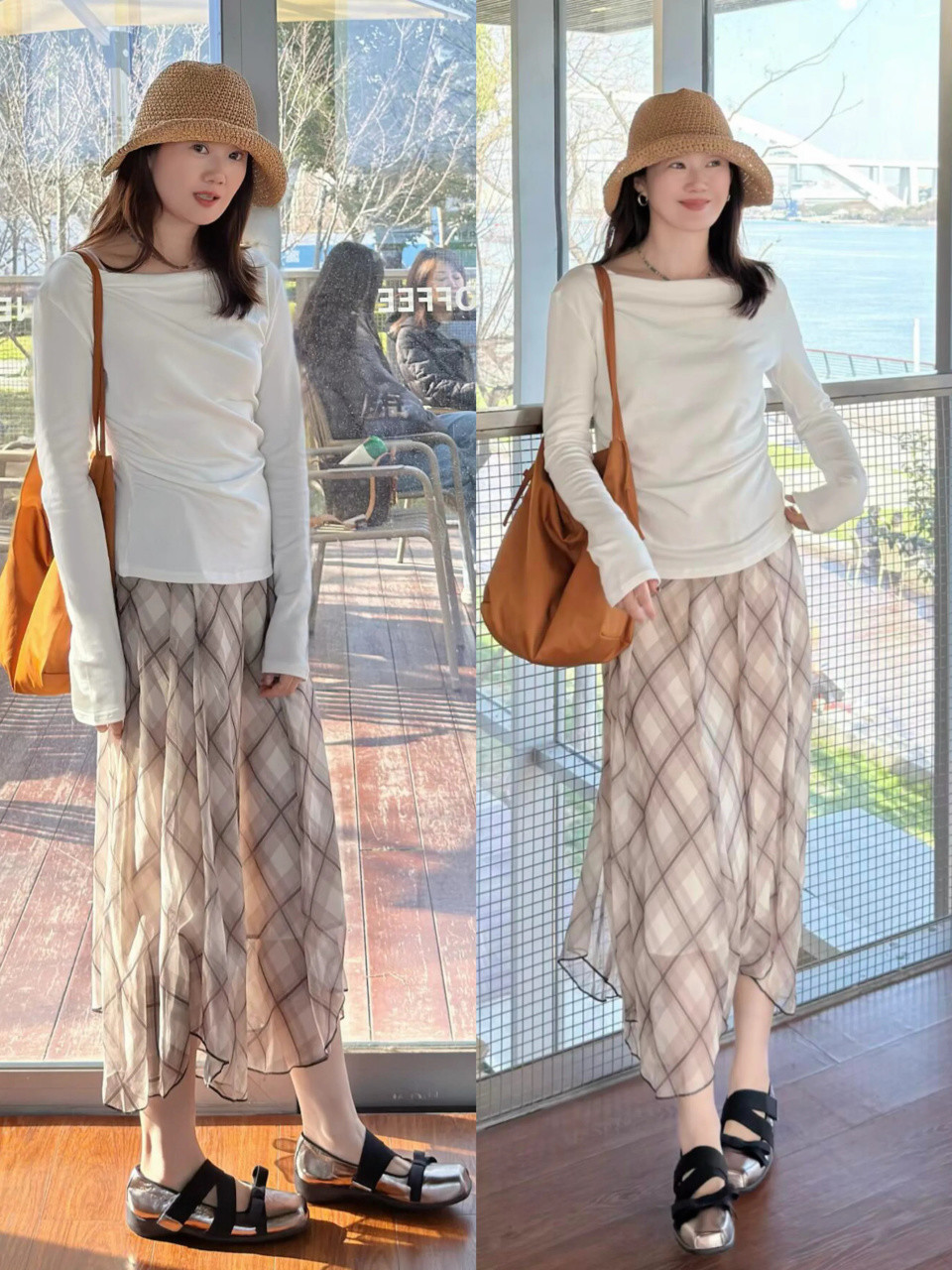 换成一条格纹的薄纱伞裙,配上一件白色的针织上衣,这样的穿搭灵动又有少女感,可盐可甜,休闲随性。