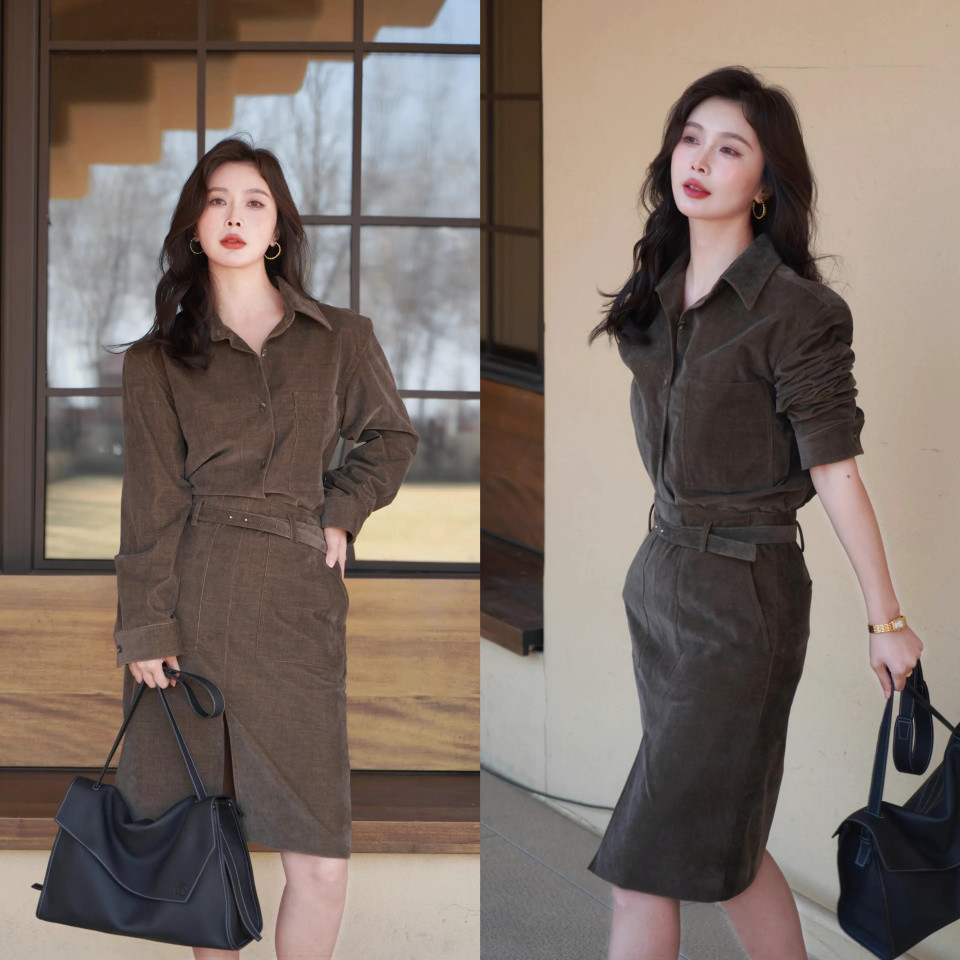 例如用棕色的衬衫裙装配上大波浪的卷发造型,这样的穿衣造型又飒又有气场,给人的感觉多了几分酷,衣服的颜色还自带复古的高级质感。