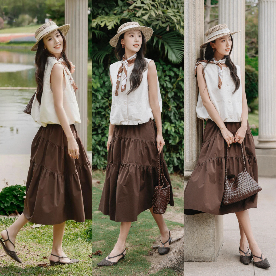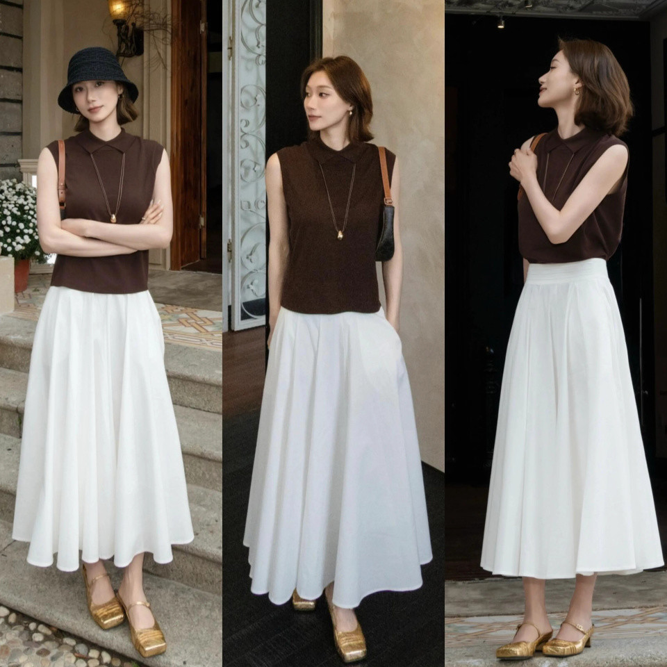若想让自己的造型比较有质感,同时更时髦,不妨选择一条棕色的伞裙,配上一件白色的无袖衬衫。脚踩一双低跟凉鞋,不费力不费时就可以轻松拿捏松弛感 。