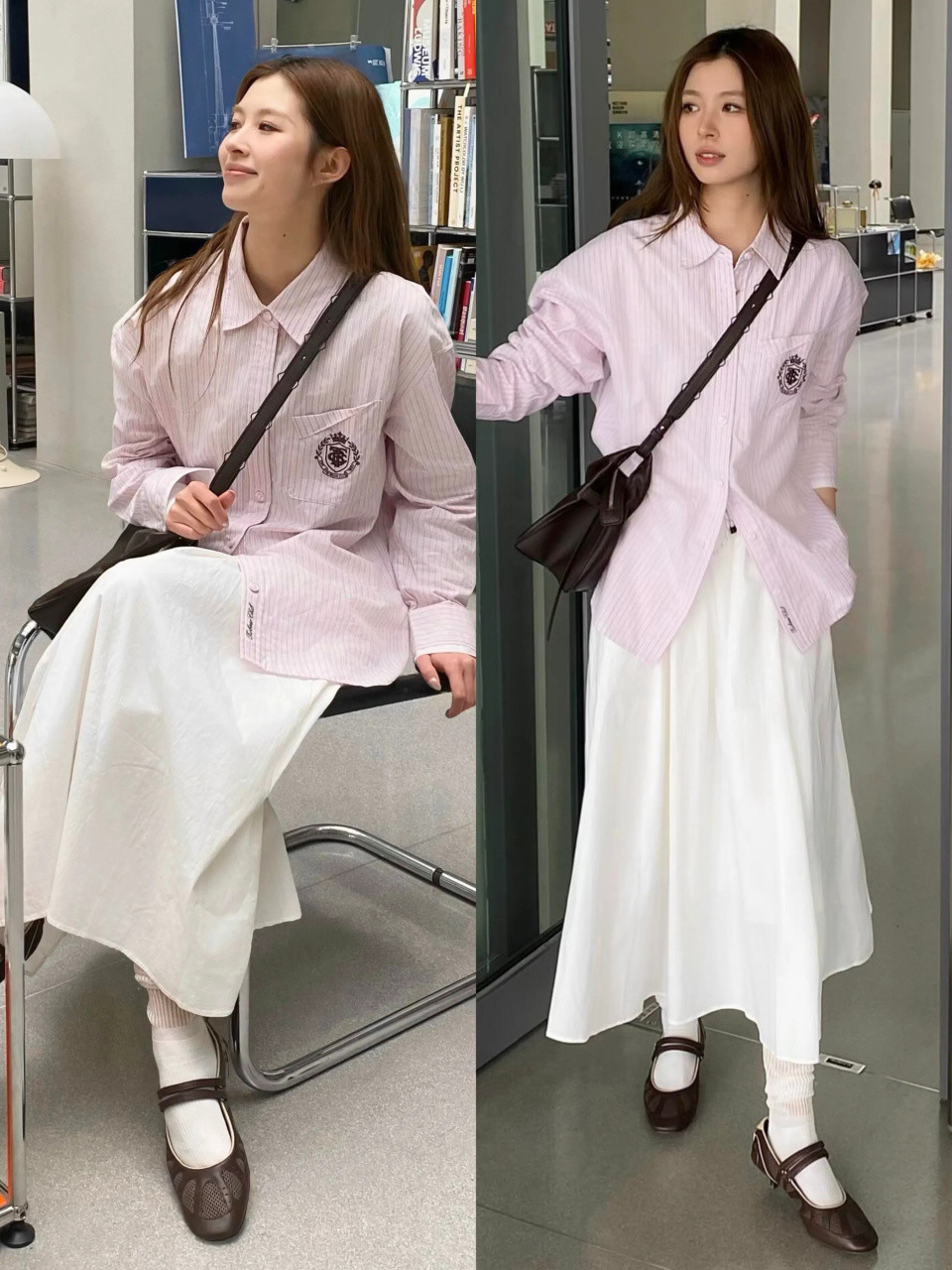 穿粉色的衬衫是个不错的选择,但版型也很关键,尽量选择小众的款式,再配上一条比较有垂坠感的白色伞裙,脚上穿的棕色的玛丽珍鞋正好和肩膀斜挎的包包形成色彩呼应,让整体配色找到了一个平衡点,甜酷平衡,松弛又时髦,谁能不爱?