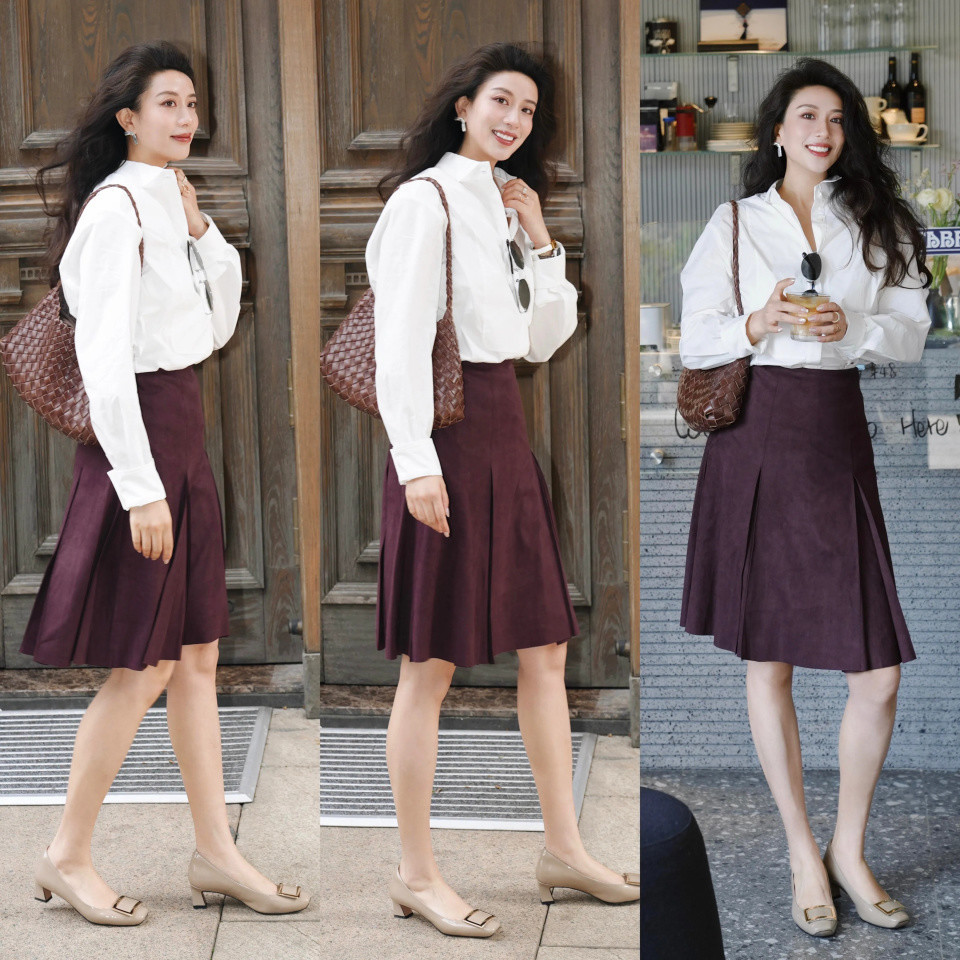 若是小腿的腿型很流畅,这时我们确实可以选择棕色的压褶伞裙来穿搭,裙长正好卡在膝盖位置,完美呈现你的腿型,脚踩一双粗跟的浅口单鞋,更显腿长。