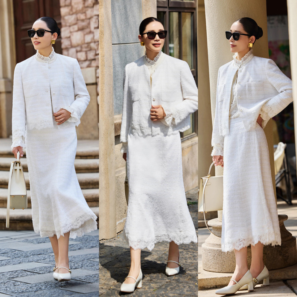 纯净的白就能让人看起来显得很高级,例如上面这一套,用白色小香风裙装,内搭白色木耳边小众衬衫和一双白色粗跟单鞋,自带精致感。就能够使得穿搭者瞬间变得高级优雅。
