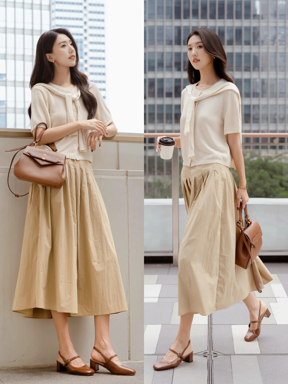 Tips③:白色针织短袖配卡其色伞裙,活力又精致