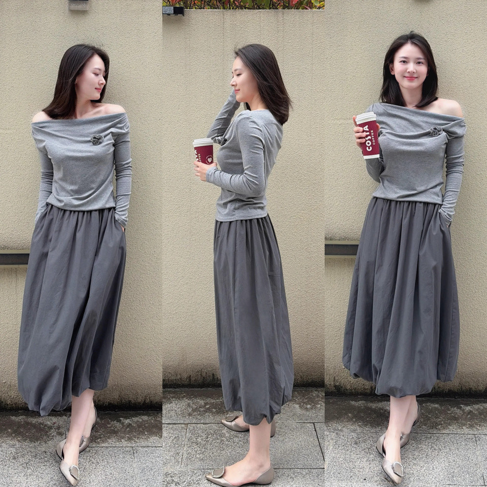 不同的衣服材质配上裙子有着不一样的氛围差异。例如用灰色的一字肩针织上衣配上灰色的伞裙,脚踩平底单鞋,既温柔又优雅。