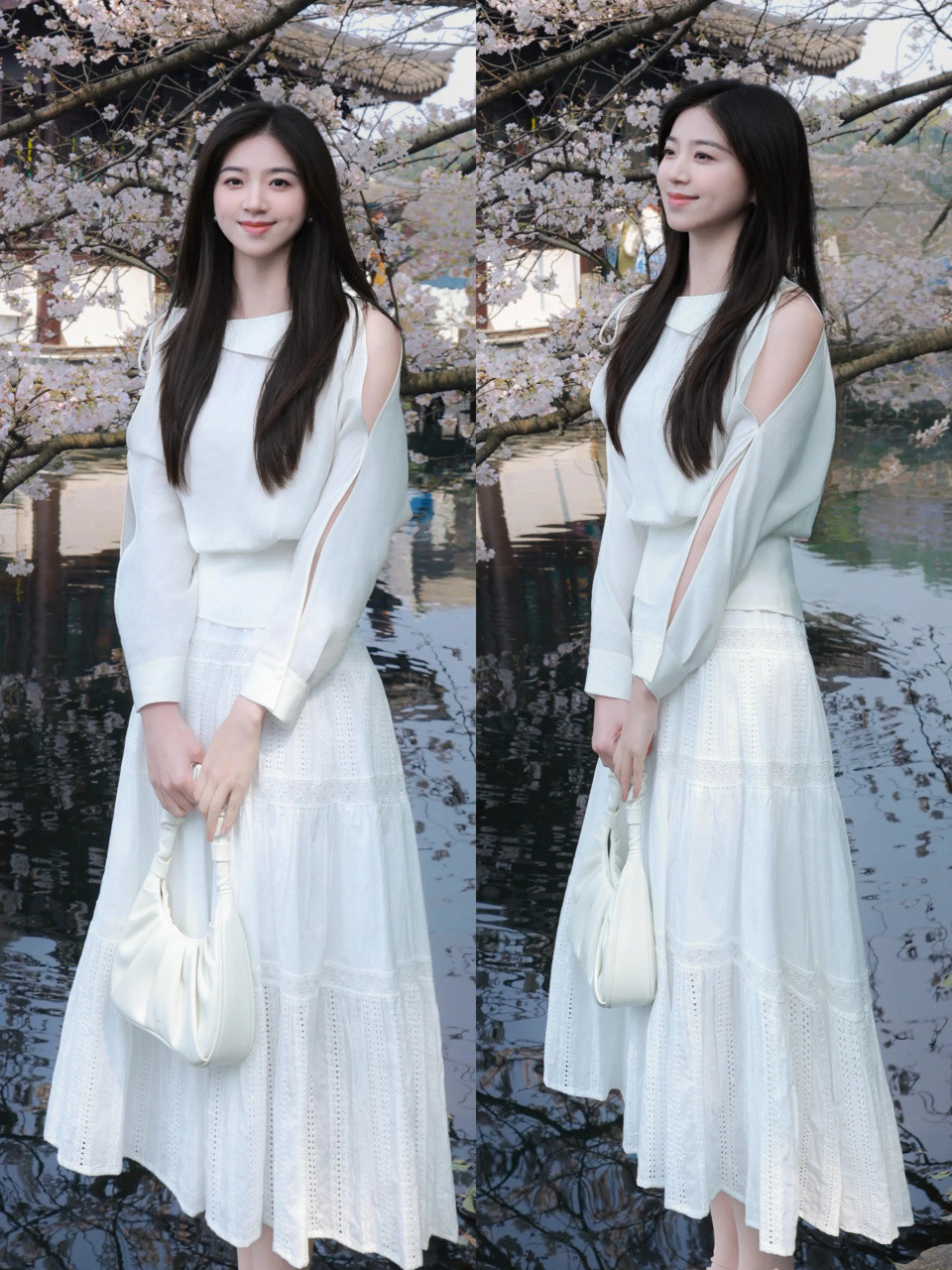 Tips④:雾霾蓝衬衫+白色伞裙,展现优雅少女