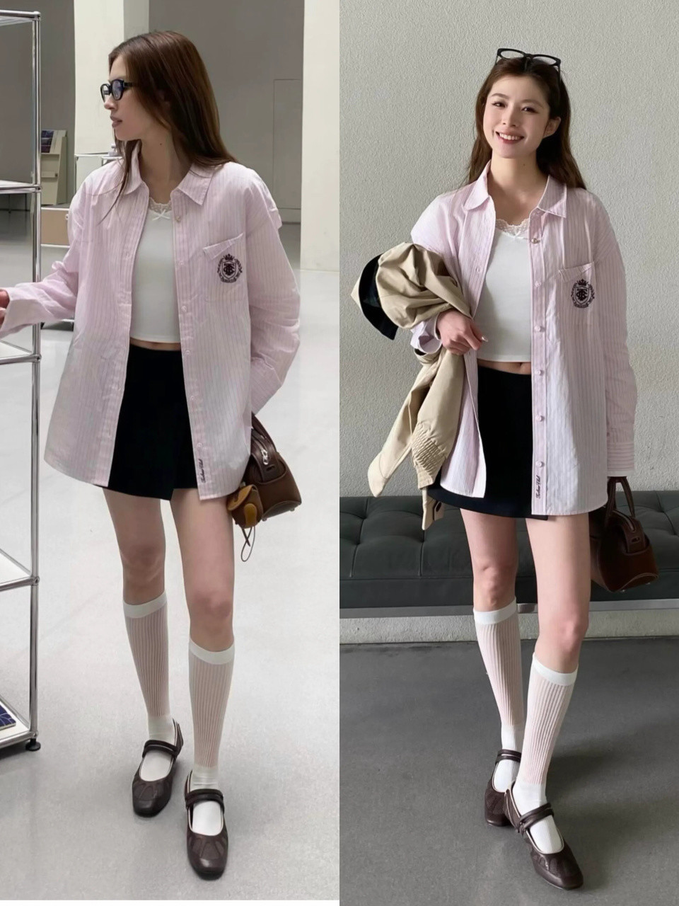 春暖花开的季节确实是展现好身材最好的时机,可以用露腰穿法,例如用白衬衫配白色短款打底衫和一条黑色的短裙,脚上穿的棕色玛丽珍鞋和白色中筒袜,轻松勾勒出你的好身形。