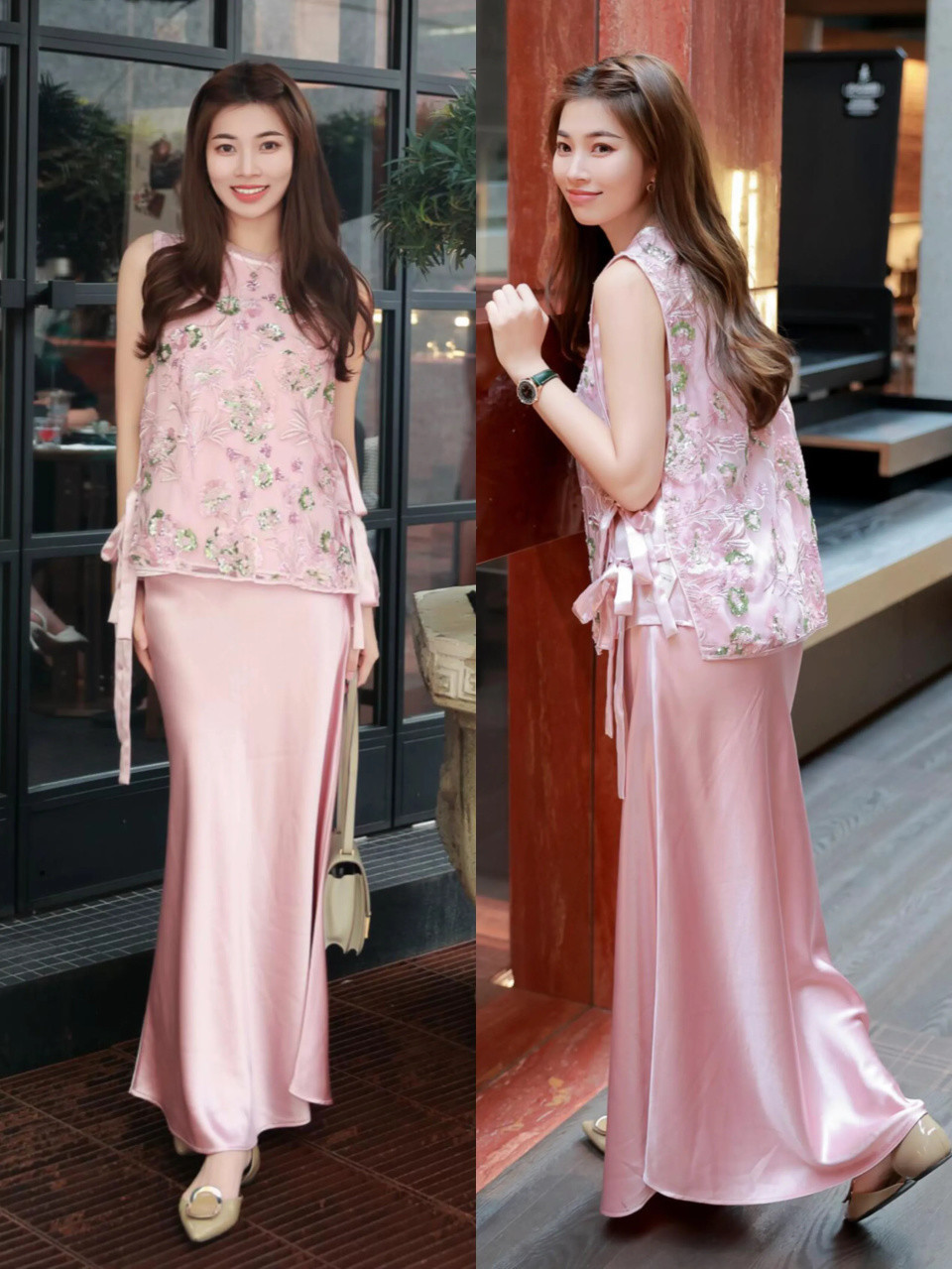 但同样是粉色的裙装造型,细微的差异也会发生改变,例如上面这种新中式的印花无袖上衣,配上缎绸面料的粉色半裙,上身效果,元气与贵气兼备。
