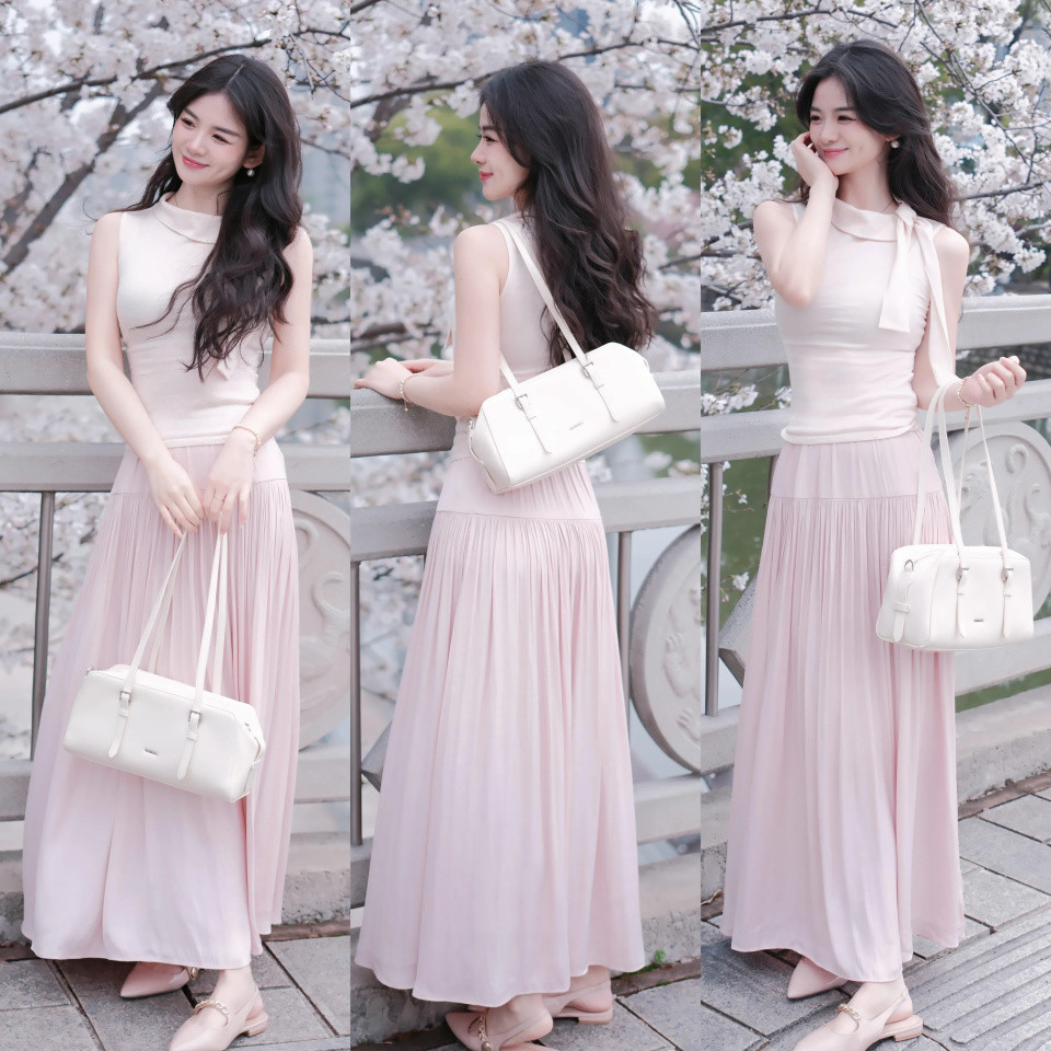 偏爱少女感,直接选择浅粉色的无袖针织上衣配上粉色的伞裙,脚踩粉色低跟单鞋,结合优雅的大波浪卷发造型,站在开满鲜花的树下拍照,就能让你变得甜美又俏皮,灵动仙气扑面而来。