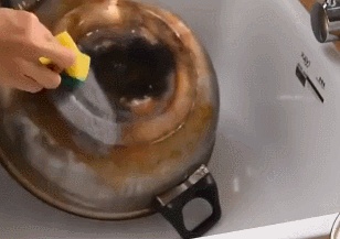 除了油烟机,家里的锅具使用时间久了也会发黄、产生污渍,严重的甚至会有厚厚的黑垢。